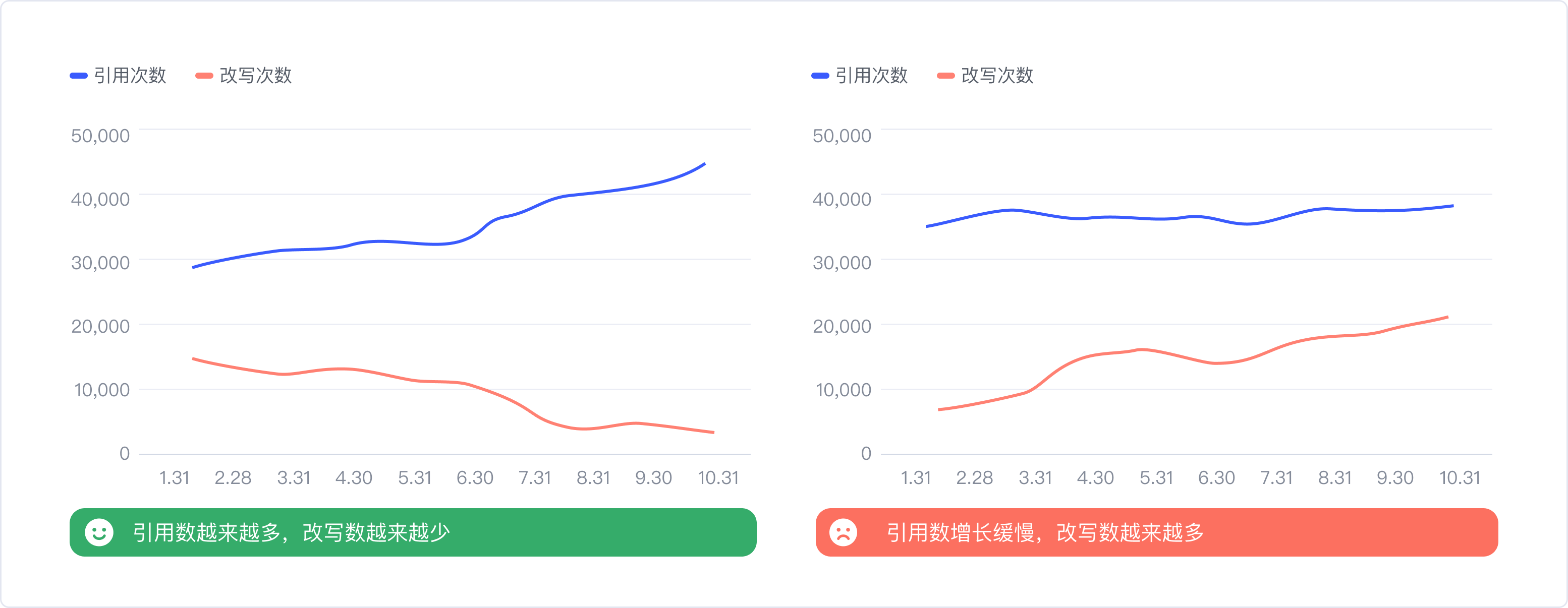 解:把所有組件的引用次數(shù)加和,得到總體數(shù)值,并結(jié)合時間維度,觀察組件庫整體改寫數(shù)與引用數(shù)各自的變化趨勢。用線形圖來描述的話,隨著時間推移,引用越多,改寫越少,兩條線呈開口狀,那就表示組件庫處于越來越健康的狀態(tài)。反之則需要警惕了。同時我們搭建了一套評分體系,基于引用/改寫數(shù)值,通過歸一化和加權(quán)等一系列計算,by月/季度給組件庫易用性打分,也能精準(zhǔn)的知道組件庫易用性的表現(xiàn),如果分值是下降的,就要具體去定位哪些組件出了問題,再根據(jù)上述的方法相應(yīng)地進(jìn)行升級。