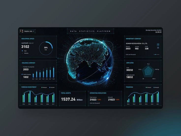 企業數據往往枯燥且復雜,而這類設計卻讓數據 “活” 了起來。深色背景與熒光色、科技藍的碰撞,既拉滿科技氛圍,又通過色彩區分數據維度,讓層級一目了然。環形圖、折線圖等可視化組件,把營收、用戶增長等數據動態展示,仿佛數據在 “講述” 企業故事。這讓我們思考:數據類 UI 不該只是 “數據的容器”,更應是 “數據的翻譯官”,蘭亭妙微在做類似設計時,也會努力讓專業數據變得更易感知、更能輔助決策。