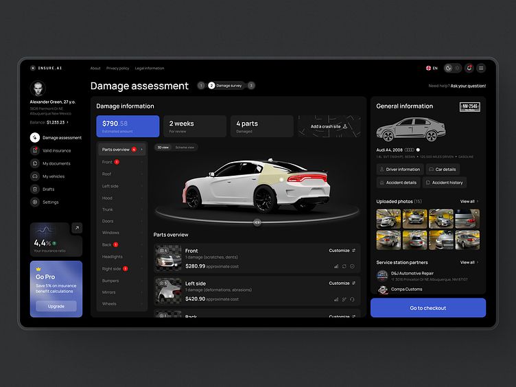 汽車定損專業性強,UI 既要體現嚴謹,又要降低用戶理解門檻。設計中,汽車 3D 模型可交互查看,受損部位色彩標注清晰,定損金額、維修時長等信息一目了然。深色界面搭配藍色操作按鈕,既符合專業場景調性,又通過色彩引導操作流程。這給我們的啟發是:專業場景的 UI,不是要 “拒人千里”,而是要通過設計,把專業內容 “友好地” 呈現給用戶,蘭亭妙微在這類項目中,也會深入調研業務流程,讓設計為 “專業” 賦能,而非添堵。