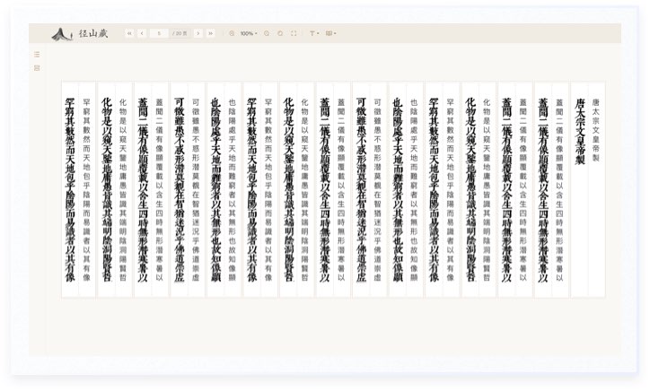 古書按列呈現,每一列都制成為長卡片,古體字和簡體字一一對應,內容和背景區分開且大量留白,列與列劃分明顯