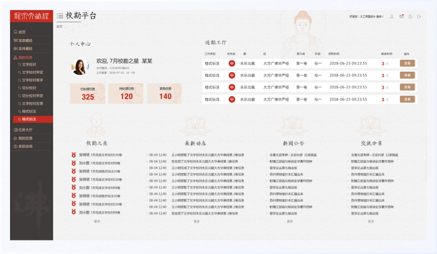 其他內(nèi)容包括“校勘之星”“最新動(dòng)態(tài)”“新聞公告”“交流分享”,四部分共同放置在頁(yè)面下方,且橫向水平等距分布,在視覺(jué)上更加和諧。